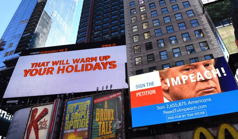 Mientras que en la otra imagen se puede ver la panorámica de Times Square en donde hay un papa Noel parado en las escaleras llevando una caja con explosivos. Dice “nos encontramos en Navidad en Nueva York”.