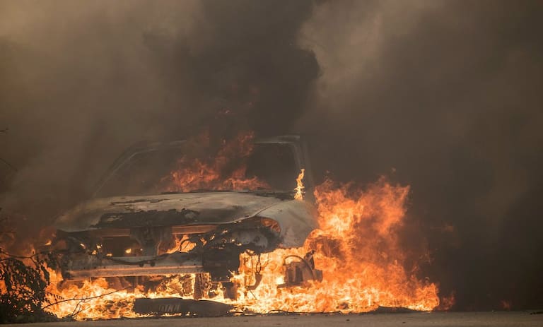 • Un vehículo envuelto en llamas durante un incendio