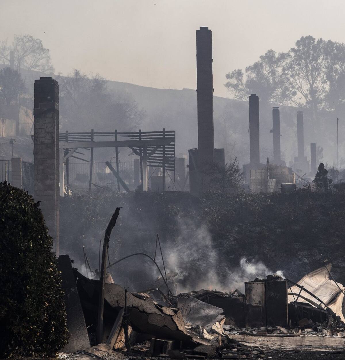 • Varias chimeneas que quedaron de varias casas incineradas por un incendio en Ventura, California