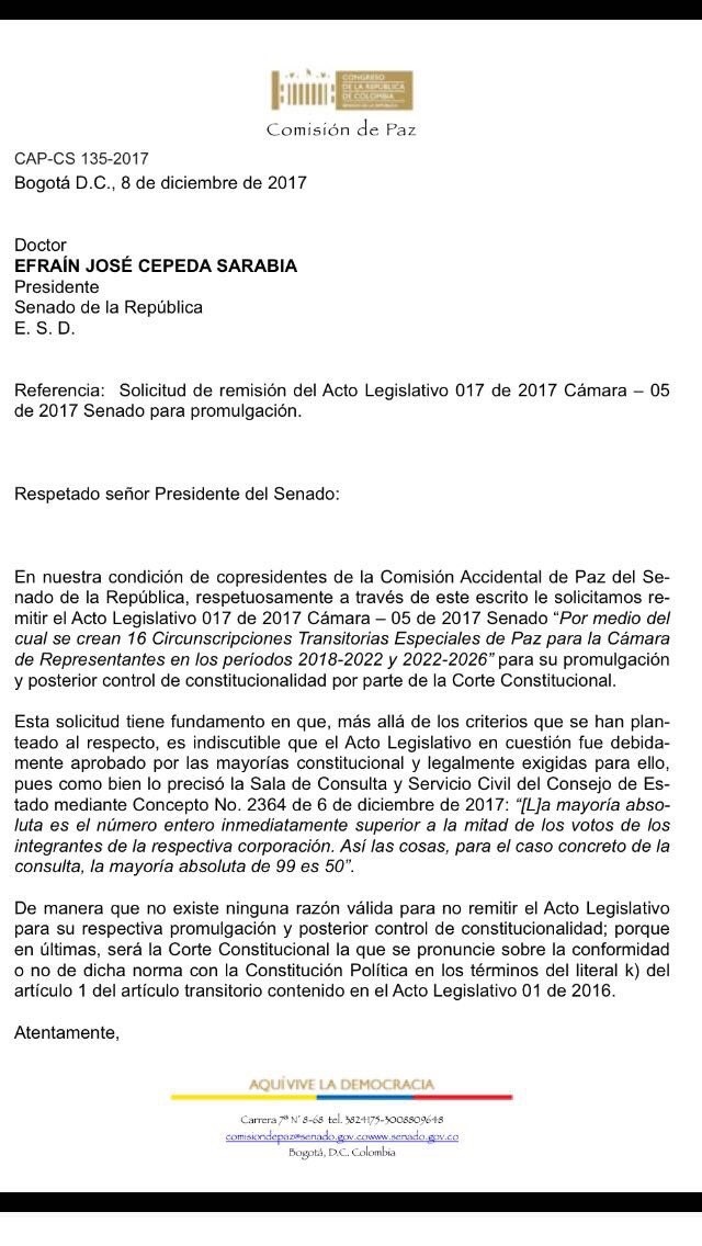 En una carta los 4 copresidentes argumentan que el último concepto del Consejo de Estado respalda la aprobación de la norma.