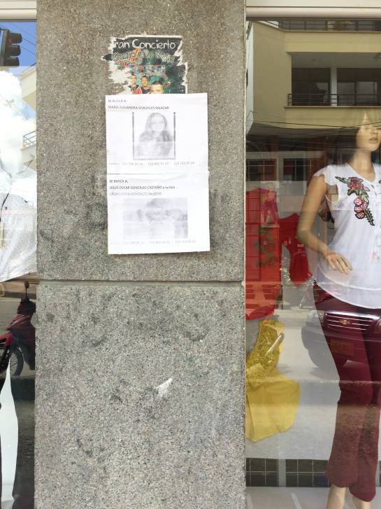 Las vitrinas de algunos establecimientos, las entradas de entidades públicas y los postes, tienen los carteles con la foto, el nombre y un mensaje para esos desaparecidos que siguen buscando y que renuevan cada vez que el mal tiempo insiste en borrarlos.