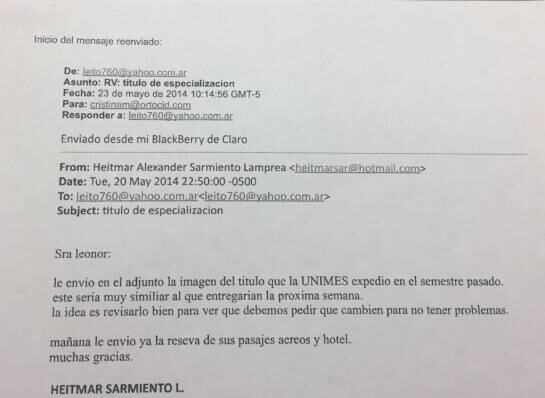 También un correo electrónico, que está en poder de la Fiscalía, y que revela una comunicación entre Heitmar y la señora Leonor, detalla cómo se coordinaba la impresión de los diplomas en Brasil para que la convalidación en Colombia marchara sin problemas.