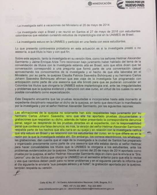 El Ministerio de Educación adelantó una investigación que confirmó como su funcionaria en 2014 se contactó con los promotores del curso en Brasil, incluso viajó y se reunió con ellos. La Funcionaria en su defensa aseguró que el viaje fue de vacaciones y que sus recomendaciones fueron como experta y no como funcionaria, pero un audio la contradice.