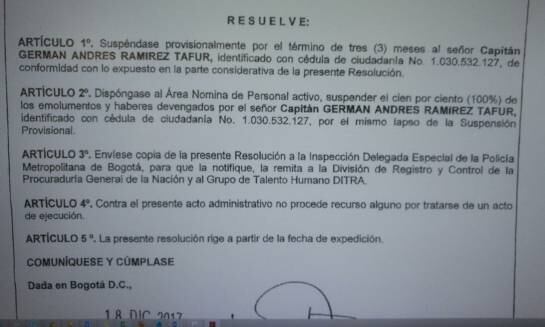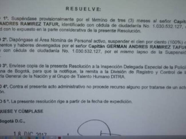 Ahora se conoció un documento que indica una nueva medida correctiva contra el oficial identificado como Germán Ramírez Tafur. Lo suspendieron por tres meses mientras avanza la investigación en su contra, la medida incluye el no pago de salarios y una remisión del caso a la División de Registro y Control de la Procuraduría para las medidas el caso.