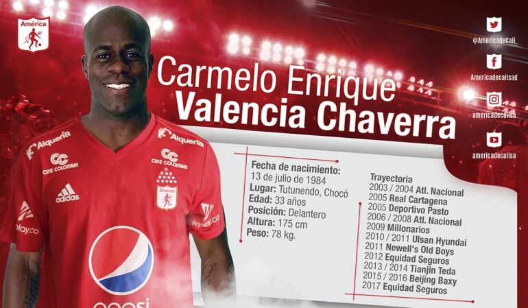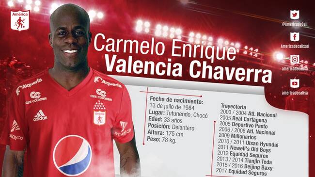 El América de Cali confirmó a través de sus redes sociales la incorporación de Carmelo Valencia, uno de los goleadores de la Liga Águila 2017-II Semestre, para el 2018.