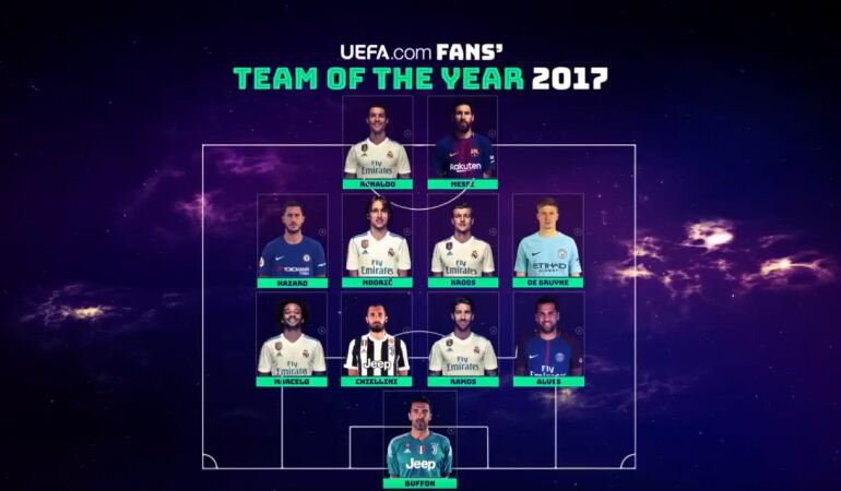 La UEFA anunció el equipo ideal del año que eligieron los aficionados en su página web. El club que más futbolistas aporta a la escuadra de ensueño es el Real Madrid con cinco jugadores, seguido por Juventus que cuenta con dos representantes.