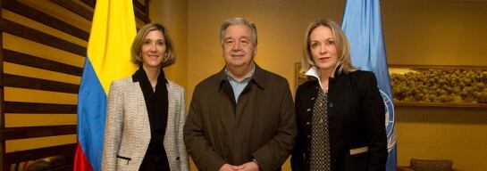 El secretario General fue recibido por la Canciller encargada, Patty Londoño y María Emma Mejía, Embajadora de Colombia ante las Naciones Unidas.