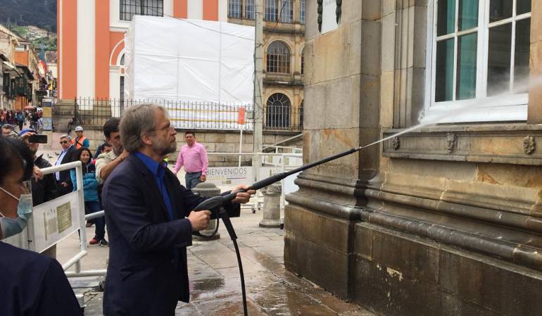 Antanas Mockus ayudó a lavar la fachada del Congreso