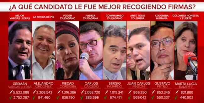 ·Germán Vargas Lleras, siendo el candidato que más firmas entregó (5.522.088) y el que más firmas válidas tuvo (2.752.287), ocupó el sexto puesto en cuanto al promedio de firmas válidas pues la Registraduría le descartó 2.769.801 firmas lo que lo deja como el candidato con más firmas anuladas.