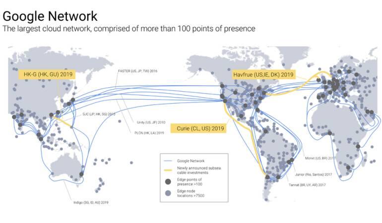 Los otros cables submarinos que instalará la compañía en 2019 serán el Havfrue (que conectará EE.UU. con Dinamarca e Irlanda y está desarrollado conjuntamente con Facebook, con el objetivo de mejorar el tráfico en el Atlántico Norte) y otro entre Guam (Pacífico occidental) y Hong Kong, que potenciará la región de Australia y el Pacífico.