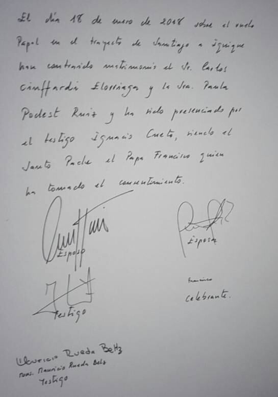 Paola Podest y Carlos Ciuffardi le contaron al papa que su matrimonio estaba programado para el 2010 cuando ocurrió un fuerte terremoto. Al oír la historia, Francisco les preguntó si querían que los casara y su respuesta de inmediato fue positiva.