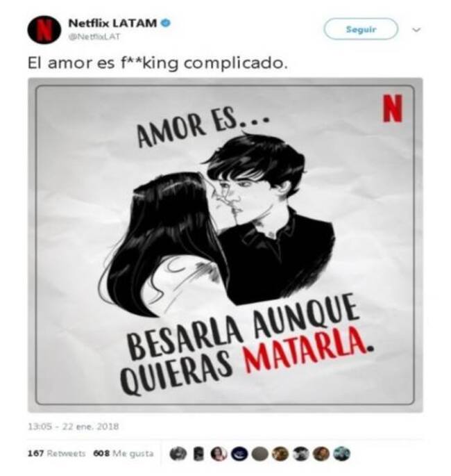 En el tuit escribieron: "el amor es f**king complicado", en relación a la serie "The End of the F***ing World", y adjuntaron una frase que dice "amor es besarla aunque quieras matarla".