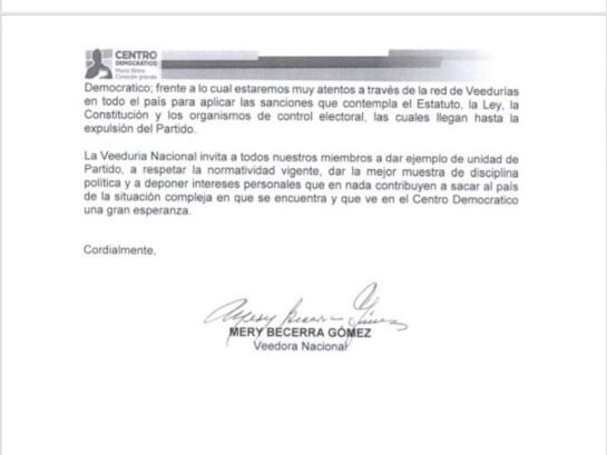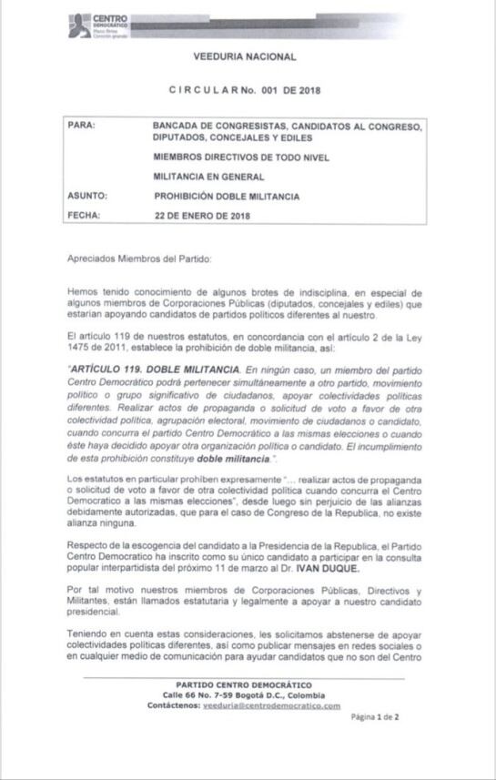 Una circular que fue elaborada por Mery Becerra, veedora del Centro Democrático, pide a los militantes del partido apoyar a su candidato para la presidencia que es Iván Duque y se advirtió que respaldar a otro aspirante sería incurrir en doble militancia.
