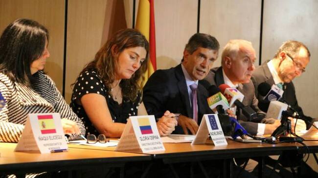 El ministro para el Posconflicto, Rafael Pardo, junto al embajador de España en Colombia, Pablo Gómez de Olea y la representante en Colombia de la Unión Europea (UE), Rachel Brazier; presentaron 3 proyectos para el posconflicto que tendrán una millonaria inversión con un importante componente internacional, para ayudar a los procesos de reincorporación, desminado humanitario y consolidación de la paz en los territorios.