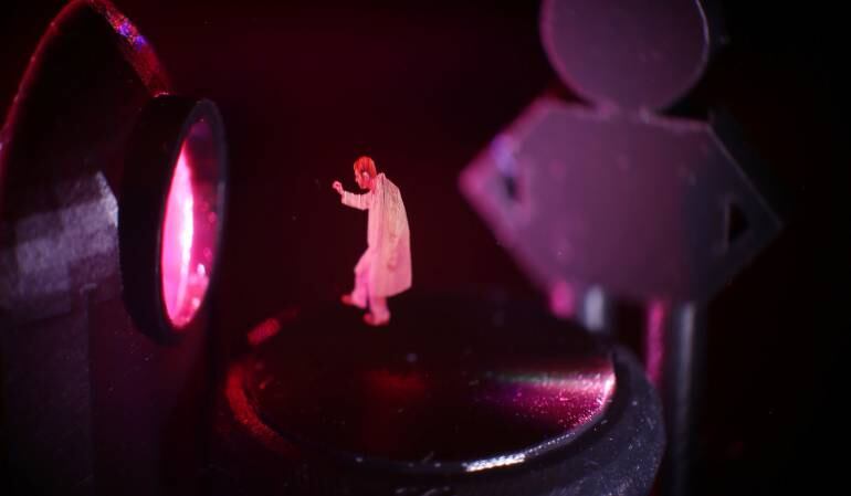 Pasar del holograma a esta tecnología _llamada visualización volumétrica_ es como pasar de la impresora bidimensional a la tridimensional, dijo Smalley. Los hologramas tienen apariencia tridimensional, pero “toda la magia sucede en una superficie 2D”.
