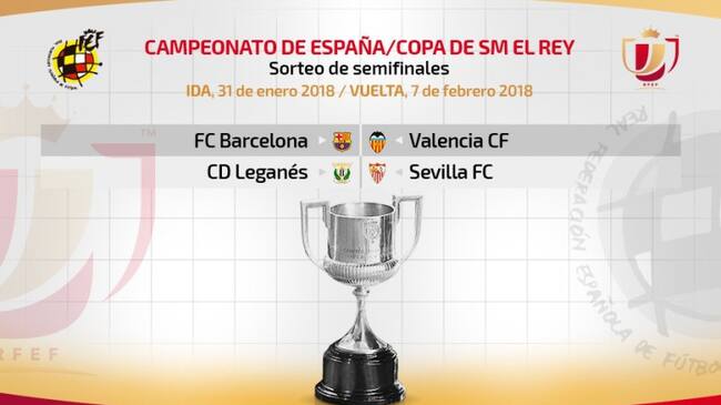 Barcelona - Valencia y Leganés - Sevilla son los emparejamientos de semifinales de la Copa del Rey, según deparó el sorteo celebrado este viernes en la sede de la Real Federación Española de Fútbol en Las Rozas, Madrid.