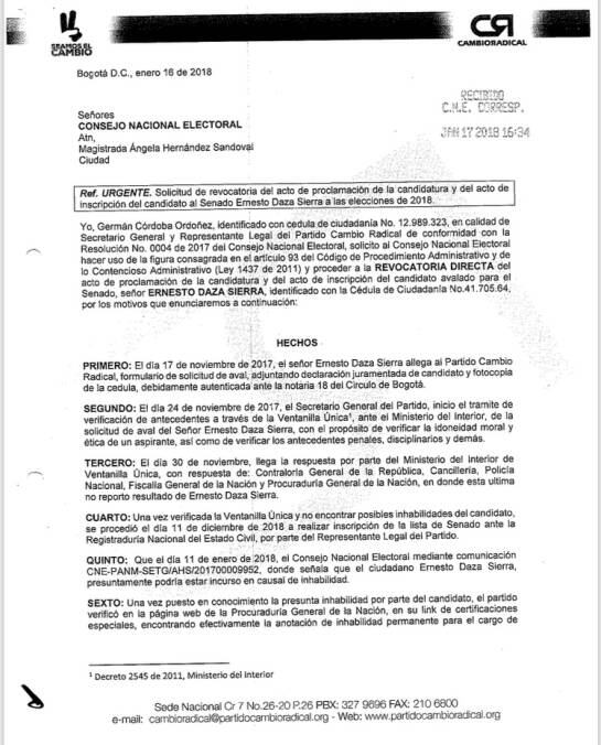 Agregó que se enteraron de la inhabilidad de Daza por el Consejo Nacional Electoral, lo que los llevó a pedir al organismo el 17 de enero que se retirará de la lista de Cambio Radical al Congreso. (Ver foto Radicado ante el CNE).