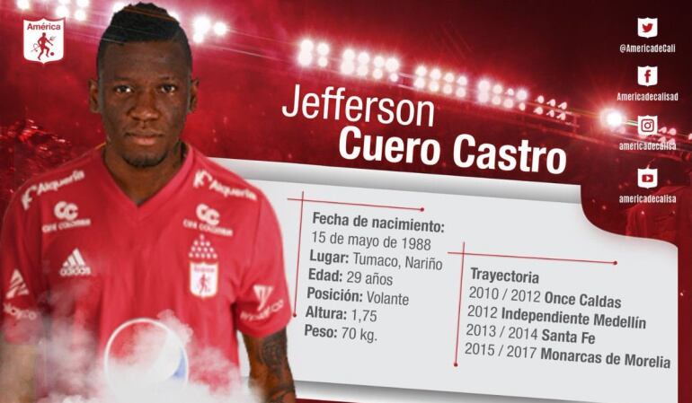 América de Cali oficializó la llegada del atacante Jefferson Cuero, jugador de 29 años que se entrena desde días atrás con el cuadro 'escarlata'. Finalmente, el cuadro vallecaucano logró un acuerdo con el Monarcas de Morelia, dueño de sus derechos deportivos, para que el jugador sea cedido durante un año.