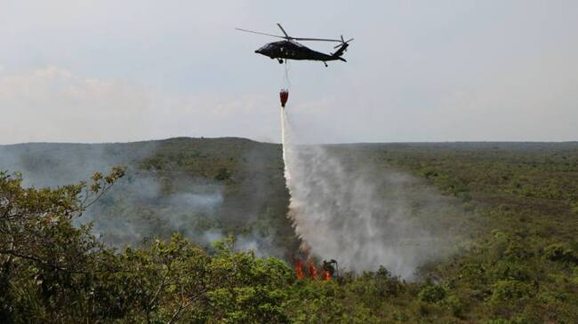 A las arduas labores de los Bomberos y la Defensa Civil del Meta se han sumado las Fuerzas Armadas con más de 12º soldados y el apoyo de un helicóptero Black Hawk dotado con el sistema Bambi Bucket que ha sobrevolado la zona por más de quince horas y ha descargado más de 30 mil galones de agua combinada con líquido retardante.