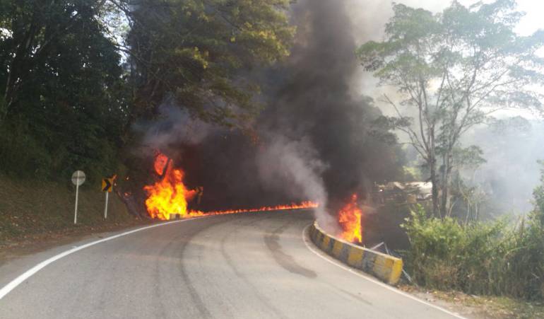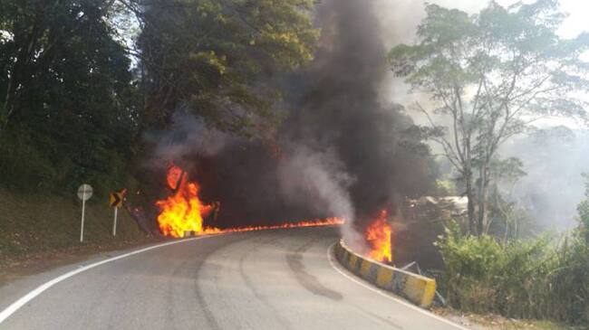 Dos carrotanques cargados de Acpm y petróleo crudo chocaron esta tarde a la altura del km 89+200 en la antigua vía Bogotá Villavicencio, provocando que se quemaran los vehículos y además un incendio sobre la vía por el derrame de combustible.