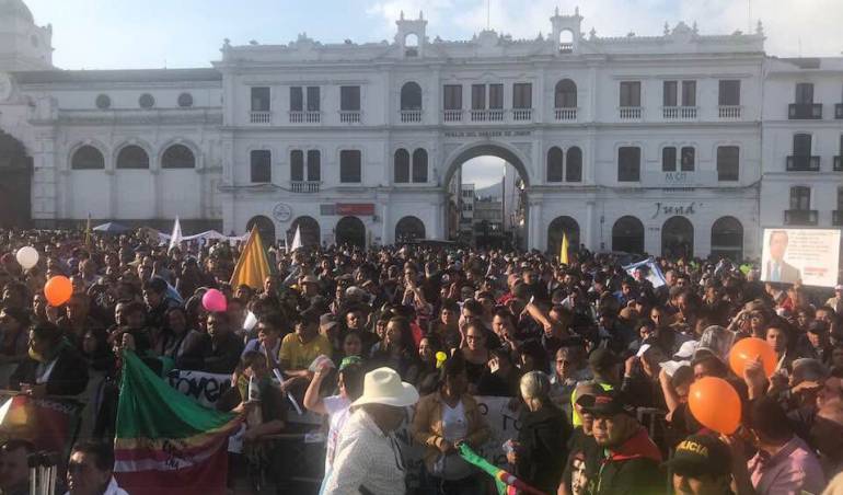 Una nutrida movilización de respaldo recorrió desde la plaza del carnaval hasta la plaza de Nariño en donde el aspirante fue acompañado por líderes sociales e indígenas de la región, ente otros.