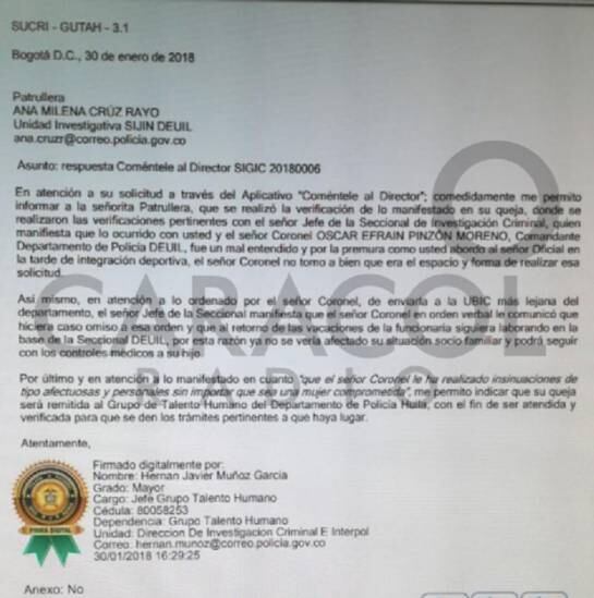 Así lo dejó en un oficio que remitió al director de la Policía, el general Jorge Nieto, con las pruebas del acoso: conversaciones, grabaciones, oficios y correos que Caracol Radio conoció. El general Nieto ordenó abrir una investigación y removió del cargo al coronel.