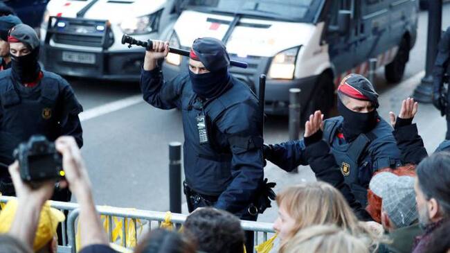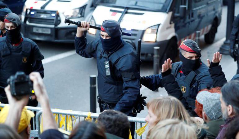 Los centenares de independentistas que todavía se manifiestan convocados por los denominados "comités de defensa de la república" cantan consignas como "No tenemos miedo", "Fuera las fuerzas de ocupación" y "Somos república", además de hacer ruidos con silbatos y cacerolas.