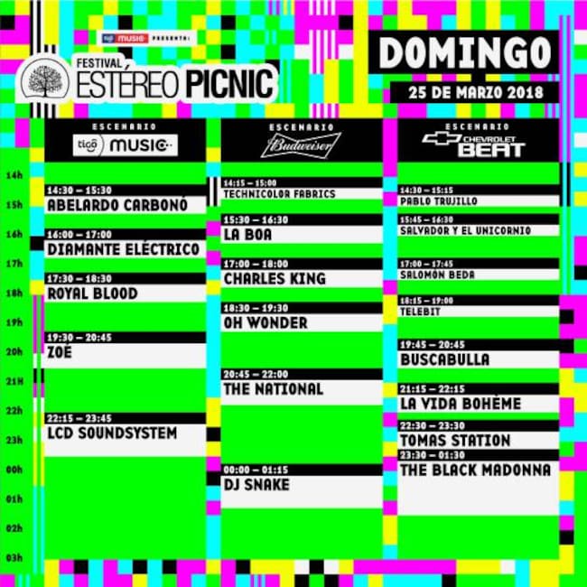 Abelardo Carbonó, Technicolor Fabrics y Pablo Trujillo abrirán el primer domingo en la historia del Festival Estéreo Picnic. Un poco de rock británico entrará hacia la tarde noche con el dúo Royal Blood. Zoé, los mexicanos nos darán lo mejor de su música desde las 7:30pm y los decanos de los sonidos contemporáneos: LCD Soundsystem empezarán a despedir 3 días de fiesta a las 10:00 p.m. The Black Madonna y DJ Snake cerraran con sus mezclas el Festival Estéreo Picnic.