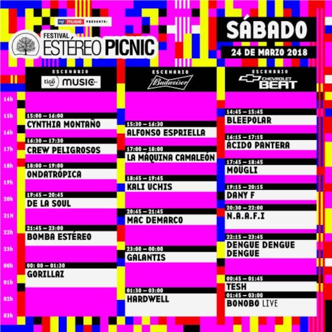 El sábado 24 de marzo la cita inicia a las 2:45pm con la música de Bleepolar. El segundo turno tendrá sabor a Colombia: Crew Peligrosos, Máquina Camaleón y Acido Pantera estarán en cada una de las tarimas del FEP. Bomba Estéreo, se encargará de encender la noche para darle paso a Gorillaz justo a medianoche. El cierre tendrá a dos leyenda electrónicas: Hardwell y Bonobo (Live).