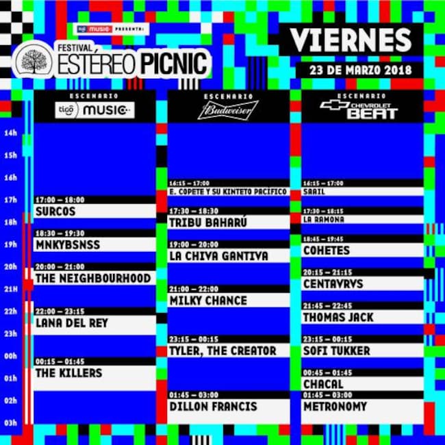 Esteban Copete & Su Kinteto Pacífico de Colombia será el encargado de darle la bienvenida a los asistentes del primer día en el Estereo Picnic. Artistas esperados como The Neighbourhood y Milky Chance estarán tocando entrando la noche. Lana del Rey será quien por hora y cuarto de dejar el ánimo por las nubes para el show de The Killers, que se montarán a la tarima sobre la media noche. El final del viernes será a cargo de Metronomy y Dillon Francis.