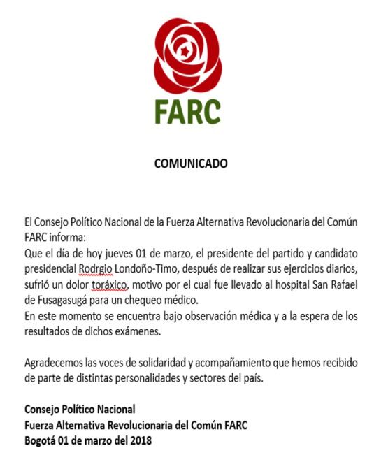 El líder del partido político Farc fue valorado inicialmente en una clínica de Fusagasugá tras sufrir un fuerte dolor en el pecho.