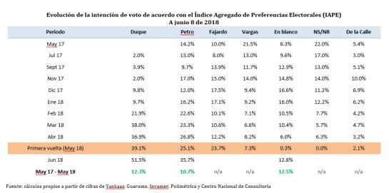 3. Frente a las votaciones efectivas de primera vuelta, el voto en blanco y Duque crecieron más que Petro en intención de voto, pues en el primer caso la diferencia entre el IAPE de junio y los resultados de la primera vuelta de mayo fue de 12.5 puntos porcentuales, en el caso de Duque de 12.3 puntos, frente al crecimiento de 10.7 puntos de Petro.