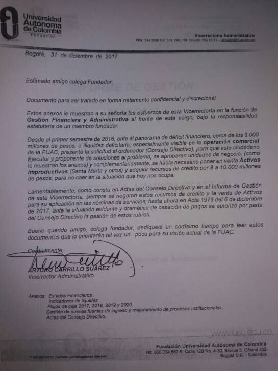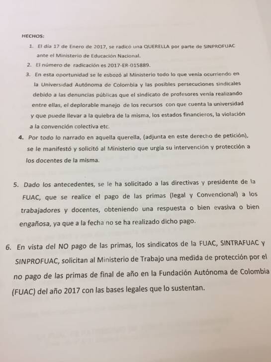 El vocero de los trabajadores, Vladimir Castiblanco, aseguró que las directivas se comprometieron a buscar soluciones. “Nos plantearon que la nómina se iba a congelar, y no se hizo. Aquí tenemos informes que muestran una crisis, un déficit y la universidad no hace nada", agregó el representante. Así quedaría evidenciado en comunicados de las directivas.