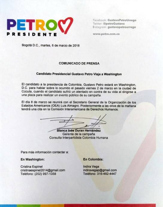 A través de un comunicado oficial, la campaña de Gustavo Petro anunció que el aspirante a la presidencia de la República viajará a Washington para reunirse el próximo 8 de marzo con el Secretario General de la Organización de los Estados Americanos (OEA) Luis Almagro, y posteriormente sobre las once de la mañana, se dirigirá a la Comisión Interamericana de Derechos Humanos (CIDH).