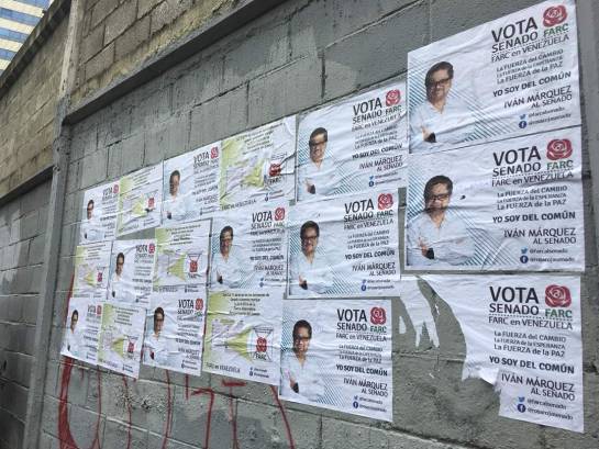 La Farc ha empapelado el Metro y varias localidades de Caracas con afiches de Márquez en los que se asegura que el candidato es “la fuerza del cambio, la esperanza y la paz”.