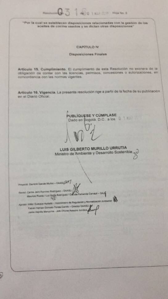 Con esta resolución se busca el aprovechamiento de este tipo de residuos de aceite, a través de un gestor que realice diferentes tipos de aprovechamientos.