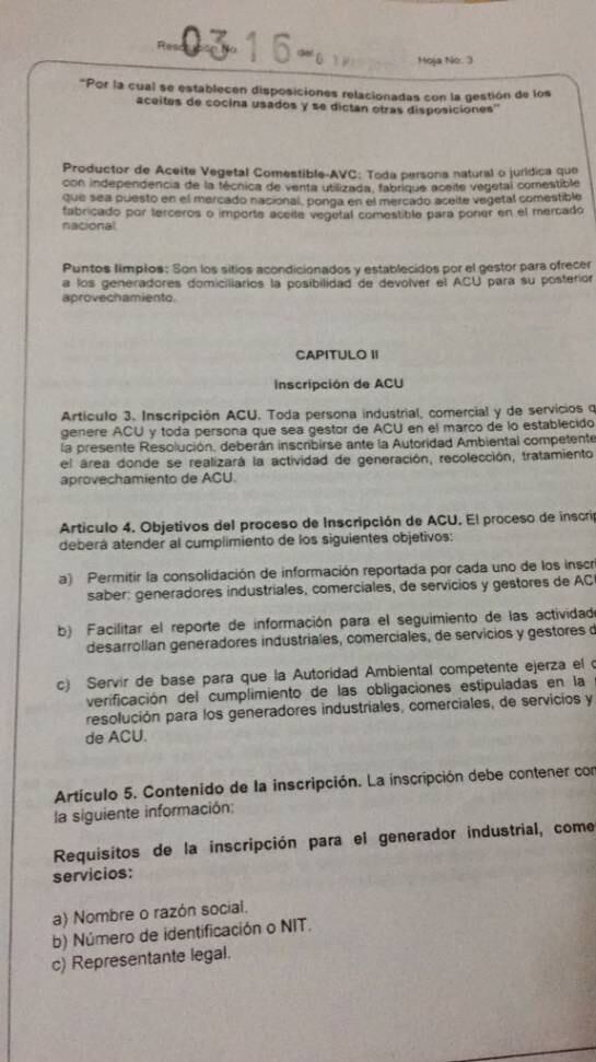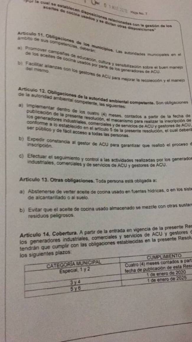 Lista resolución para manejo de aceites usados de cocina