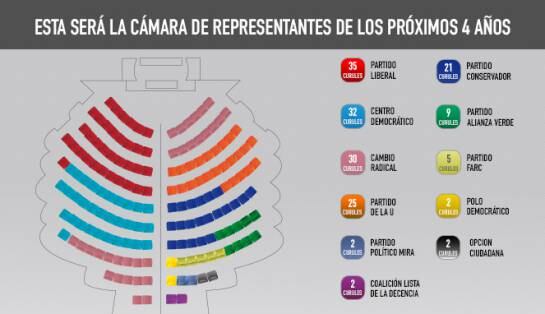 El Partido Liberal lidera la conformación de la Cámara de Representantes al obtener 35 curules y en 14 departamentos.