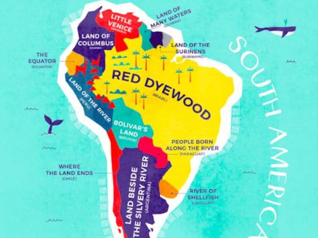 Por otra parte en Sudamérica destaca el origen del nombre de los países como Bolivia (Tierra de Bolivar), Brasil (Madera de tinta roja) y Colombia que significaría "Tierra de Columbus".