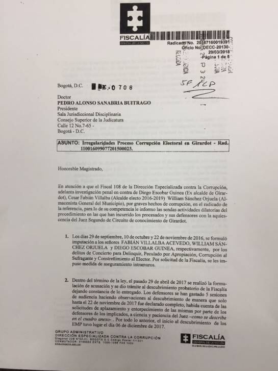 En un documento Salas aseguró que la Fiscalía cumplió con los tiempos del proceso pero la juez permitió aplazamientos de la defensa, eso derivó en un vencimiento de términos y la libertad de Cesar Fabián Villalba y Diego Escobar Guina, alcalde y ex alcalde de Girardot dos días antes de las elecciones legislativas.