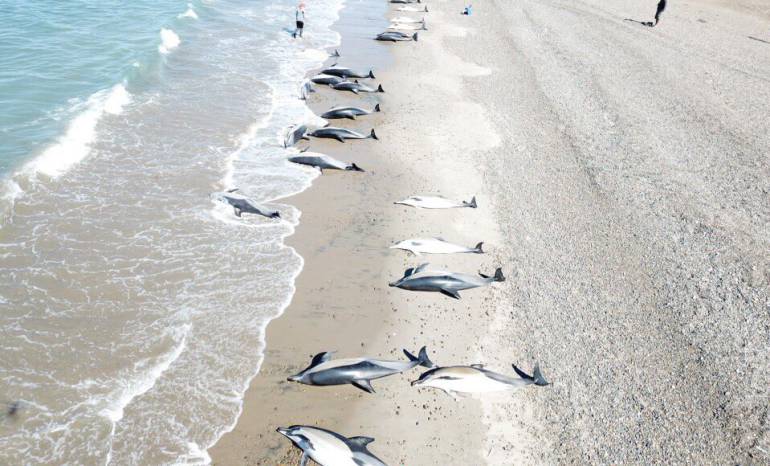 Un total de 68 delfines, 49 de ellos muertos, fueron hallados en una playa de la localidad de Puerto Madryn, en la sureña provincia de Chubut.
