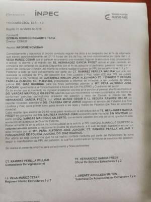 En un informe del comandante del Inpec Germán Rofrigo Ricaurte, informó sobre la fuga de los ex combatientes de las Farc, en donde narra el estado en el que se encontraba uno de los guardias de vigilancia al momento en que los presos se dieron a la fuga.