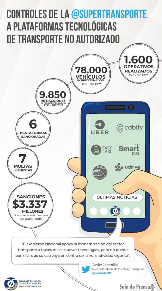 “Las sentencias recientemente emitidas por la Corte Constitucional, la Cámara de Apelaciones de Buenos Aires y el Tribunal de Justicia de la Unión Europea nos dan la razón: las empresas de tecnología que faciliten la prestación del servicio de transporte público deben regirse bajo las normas vigentes que regulan este sector en el país que decidan operar. El gobierno expidió en 2015 una reglamentación que no han querido acatar, razón por la cual es nuestra obligación investigar y sancionar a las empresas que presten servicios de transporte por fuera de la Ley”, advirtió Jaramillo.