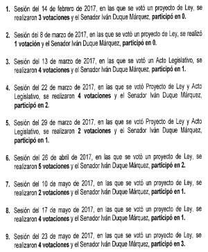 La demanda contra Duque la interpuso, Adriana Posso Rodríguez, quien le dice al Consejo que el congresista faltó a 9 sesiones plenarias entre el 14 de febrero de 2017 y el 20 de junio del mismo año, señalando que no existe justificación válida alrededor de sus ausencias.