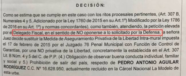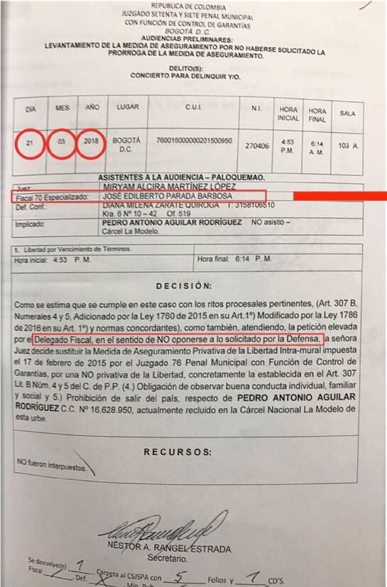 La audiencia había sido solicitada por la defensa de Aguilar, según aclaró la Fiscalía. El motivo era para que un juez de la República tumbara la decisión de otro juez que había ordenado enviar a una cárcel (Modelo) a Aguilar.