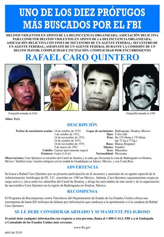 Hasta 20 millones de dólares de recompensa ofrecen las autoridades de Estados Unidos por información que pueda llevar a la captura de Rafael Caro Quintero, el reconocido narcotraficante mexicano que fue nombrado como una de las 10 personas más buscadas por el FBI.