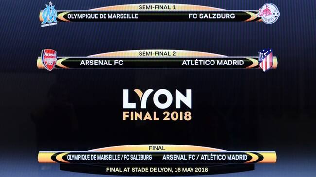 Olympique Marsella-Salzburgo y Arsenal-Atlético de Madrid serán las semifinales de la Liga Europa 2017/18, según el sorteo celebrado este viernes en la sede de la UEFA en Nyon (Suiza).