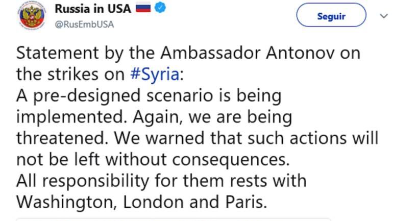 "Los peores presagios se han cumplido. No han escuchado nuestras advertencias. Nos vuelven a amenazar. Habíamos advertido de que estas acciones no se quedarán sin consecuencias. Toda la responsabilidad recae en Washington, Londres y París", dijo Antónov en una declaración oficial difundida por la Embajada.