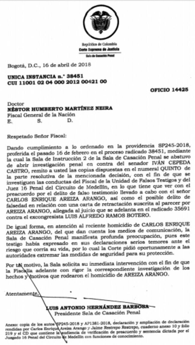 Cuenta que, “La Corte Suprema llama a declarar a Areiza y les dice ‘jamás escribí esa carta, jamás el congresista Iván Cepeda me ha insinuado o me ha ofrecido dádiva alguna para declarar mentiras’”.