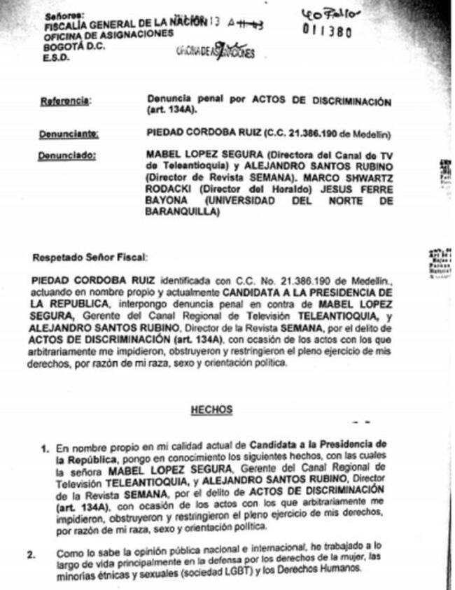 La ex candidata por el movimiento Poder Ciudadano, Piedad Córdoba, tras no ser invitada a los debates presidenciales de Antioquia y Barranquilla interpuso una denuncia por discriminación en esta campaña presidencial.